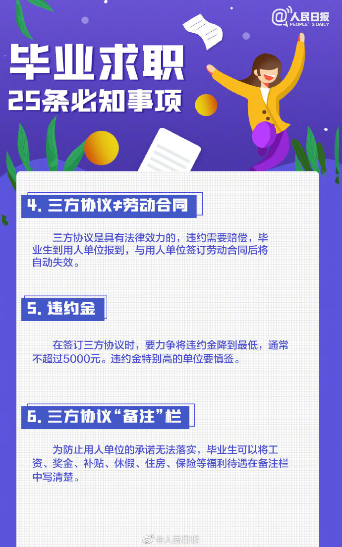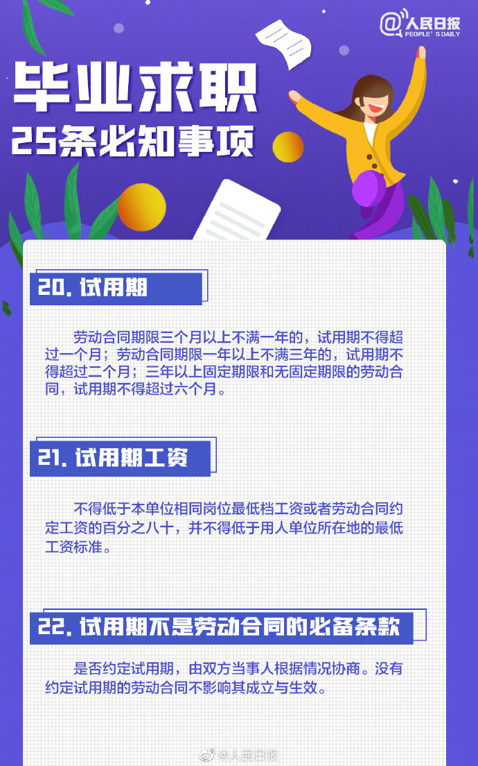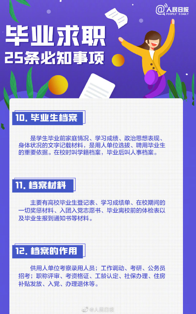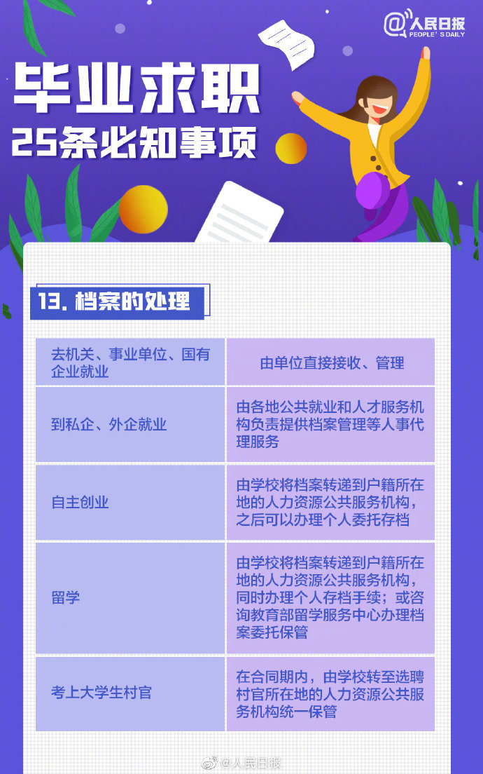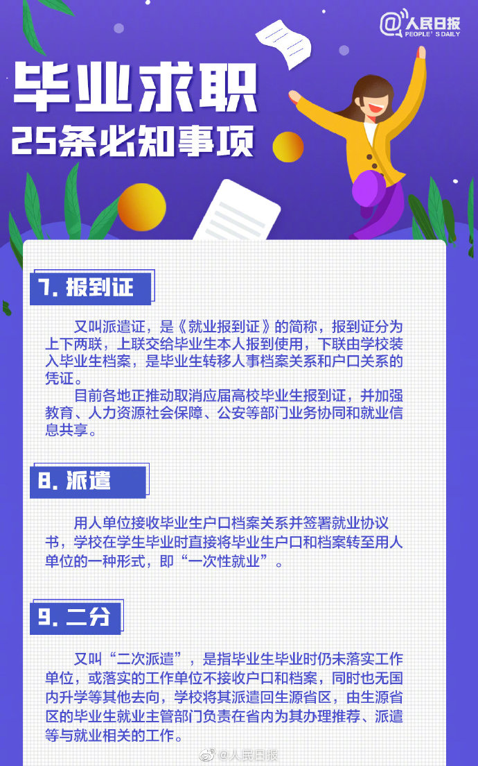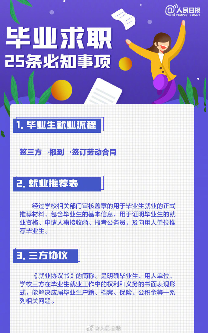 2021-05-13 09:41:26閱讀()人民日報離2021年畢業(yè)季已不到50天,今年高校畢業(yè)生總規(guī)模預計909萬人。即將畢業(yè)的你是否還在忙著投簡歷、找工作?派遣、二分、檔案、試用期……這些詞,你都搞清楚了嗎?簽勞動合同要關注哪些要點?求職前,這些事你應該了解↓↓轉(zhuǎn)給即將離校的你,祝一切順利,畢業(yè)快樂! ????