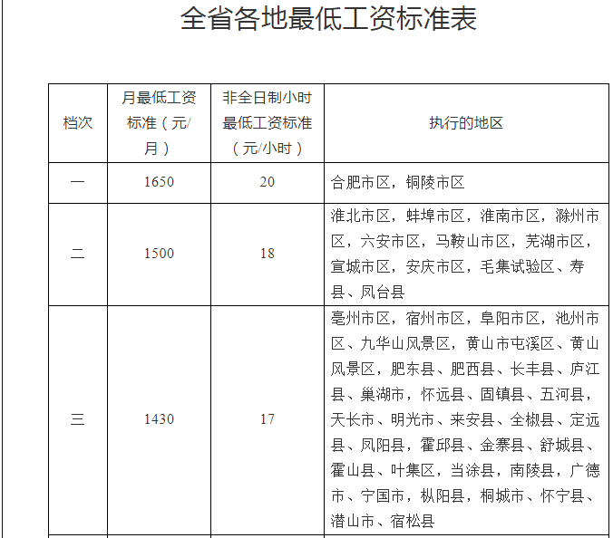 在最新最低工資標準中,合肥市區(qū)、銅陵市區(qū)是月最低工資標準1650元/月最高,非全日制小時最低工資標準20元/小時),也是最高。