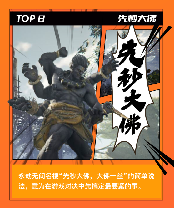 “先秒大佛”源自于《永劫無間》中的游戲角色天海和尚,人物釋放技能會(huì)變身成為一樽巨大的佛僧(故稱為“大佛”)且具有極強(qiáng)的戰(zhàn)斗力,所以玩家們?cè)谟螒蛑信龅酱蠓鸷?,通常?huì)在其血量見底時(shí)互相溝通“先秒大佛”。這個(gè)詞也可以引申意思也可以是快速搞定最重要的事情。