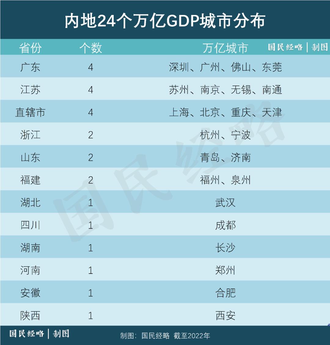 早在改革開放之初的1978年,廣東經(jīng)濟總量落后于上海、江蘇、山東、遼寧等省份。1979年到1988年,江蘇、山東曾輪流位居全國首位,直到被廣東所取代,且領先優(yōu)勢不斷增強。30多年來,廣東GDP總量從1989年的1400億增長到12萬億,無論是增長速度還是發(fā)展質量,均是首屈一指。這些年,廣東經(jīng)受了非典、全球金融危機、新冠疫情等沖擊,但借助強大的經(jīng)濟韌性,始終保持著高增長態(tài)勢,穩(wěn)居全國經(jīng)濟第一大省之位。國民經(jīng)略主筆 凱風 新著,清華大學出版社出品,點擊圖片查看02廣東,是全國萬億GDP城市最多的省份之一。截至2022年,全國共有24個萬億GDP城市,其中南方18個,北方6個。廣東與江蘇,各有4個城市入圍,領跑各大省份。