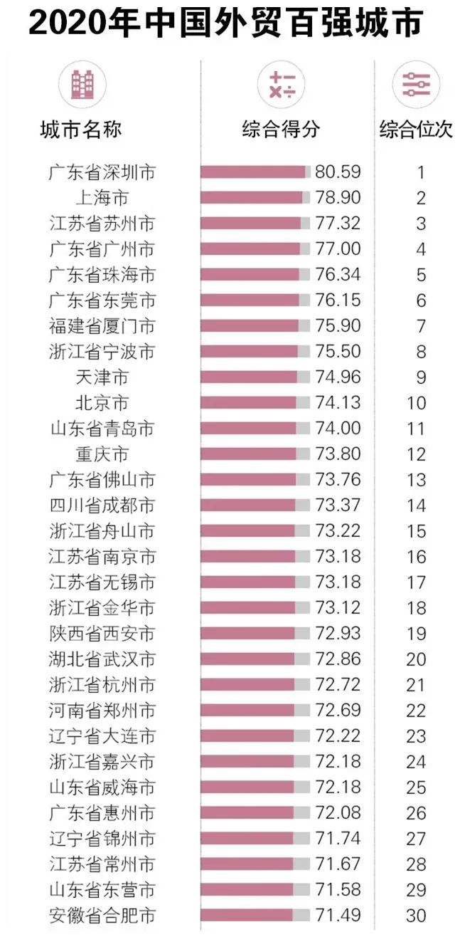 可以說,先進制造業(yè)的發(fā)展,決定了工業(yè)大省發(fā)展的未來。誰能在戰(zhàn)略性新興產(chǎn)業(yè)里搶得先機,誰就能在未來的發(fā)展中占據(jù)優(yōu)勢。06廣東,第一外貿(mào)大省。2021年,廣東外貿(mào)進出口總額突破8萬億元,超過全國(39.1萬億元)的1/5,連續(xù)35年位居全國第一。作為“世界制造工廠”,廣東一直都是傳統(tǒng)外貿(mào)大省,其中以智能手機、家用電器、液晶顯示等為代表的機電產(chǎn)品占了出口的半壁江山。在2021年中國海關發(fā)布的外貿(mào)百強城市榜單中,TOP10城市里廣東占了4席,包括深圳、廣州、東莞、珠海。