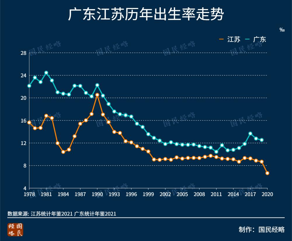 與國際對比,廣東常住人口規(guī)模已經(jīng)追平日本。日本由于“少子化+老齡化”的困擾,總人口已經(jīng)連續(xù)12年減少,總人口已經(jīng)萎縮到1.26億人左右。正如凱風君新書《》的分析,廣東人口之多,一方面得益于高出全國平均水平的出生率,自然增長人口遠高于長三角;另一方面得益于外來人口源源不斷涌入,人口吸引力全國最強。廣東人口出生率一直全國前列,遠高于長三角地區(qū)。最新公布的人口統(tǒng)計數(shù)據(jù)顯示,2021年全國出生人口1062萬人,出生率7.52‰,創(chuàng)下歷史新低。(參閱《逼近千萬大關!人口大變局即將降臨》)各省份2021年生育數(shù)據(jù)尚未公布。但從2020年數(shù)據(jù)來看,多數(shù)省份都出現(xiàn)明顯下滑,江蘇人口出生率僅為6.66‰,相比上年下降2.03個千分點,連續(xù)21年低于1%(即10‰)的水平。