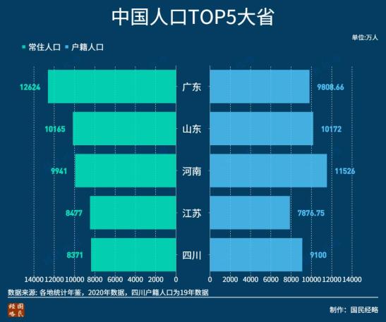 其中,廣州深圳在2010年前后就已邁入萬億俱樂部,佛山則是2019年突圍,東莞在2021年晉級,也是當年唯一晉級的萬億城市。(參閱《官宣!又一個萬億GDP城市誕生》)眾所周知,廣東之強,強在珠三角。而在珠三角,廣深是龍頭,佛莞是省級經(jīng)濟中心城市,其他地市經(jīng)濟總量都不高,離萬億大關都還有相當長的距離。在東莞之后,惠州、珠海、汕頭、湛江等地市GDP不到5000億,想要突破萬億,可能需要5-8年時間。面向未來,惠州表示2026年GDP突破8000億元,珠海則表示力爭五年GDP超6000億元,2035年突破2萬億。就全國來看,未來5年,將會有一批城市沖刺萬億俱樂部,包括江蘇常州、徐州,山東煙臺,遼寧大連,河北唐山等。03廣東還是全國人口第一大省。2020年底,廣東常住人口高達1.26億人,比第二名的山東省多了2400多萬,相當于多了一個上海的人口規(guī)模。當然,若論戶籍,第一人口大省當屬河南。不過,河南由于大量勞動力到外務工,常住人口比戶籍人口少了1600萬人。(參閱《這些超級人口大省,也生不動了》)