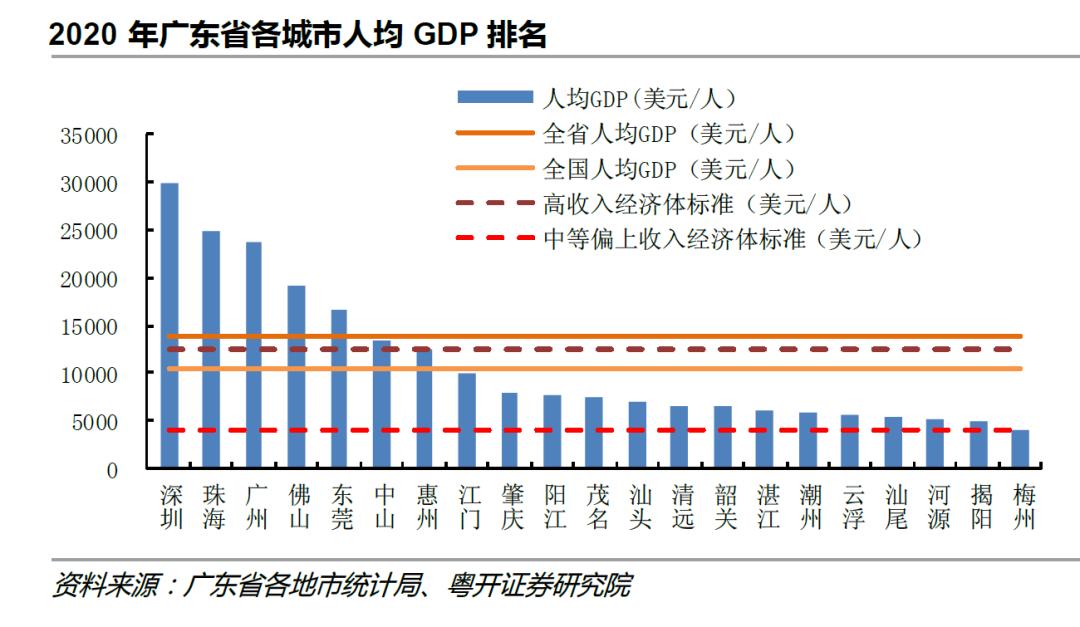 不過,隨著國際疫情形勢變化,外貿(mào)將會受到一定挑戰(zhàn),高增長態(tài)勢難以持續(xù),主要外貿(mào)城市發(fā)展或會受到影響。2020年以來,雖然全球疫情形勢日益嚴峻,但由于我國迅速遏制疫情擴散,供應鏈體系得以迅速恢復,借助強大的工業(yè)體系,我國外貿(mào)進出口在疫情期間逆勢擴張,對于穩(wěn)經(jīng)濟發(fā)揮了關鍵作用。不過,正如官方有關人士所分析的:“當前全球疫情起伏反復,外部環(huán)境更趨復雜嚴峻和不確定,我國經(jīng)濟率先恢復的相對優(yōu)勢和基數(shù)效應可能減弱,2022年我國外貿(mào)發(fā)展面臨的不確定不穩(wěn)定不均衡因素增多”。所以,如何穩(wěn)外貿(mào),是擺在所有外貿(mào)大省面前的一道考題。07廣東并非沒有短板。據(jù)《》一書分析,廣東雖然經(jīng)濟發(fā)展強勁,但區(qū)域發(fā)展并不均衡:既有富裕程度遙遙領先的珠三角,也有相對不發(fā)達的粵東西北。廣東下轄21個地市,雖然深圳、珠海、廣州人均GDP位居全國前列,但還有2/3的地市人均GDP低于全國平均水平,最低的梅州,人均GDP僅為3.1萬元,不到深圳的1/5。