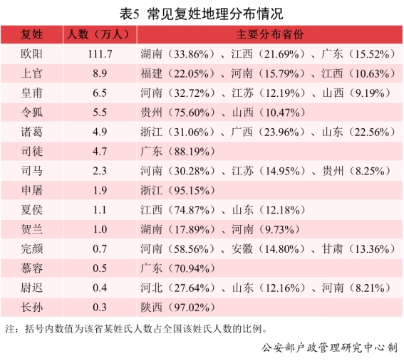 常見復姓“聚居”的特點非常突出,復姓人口在個別省份的分布較為集中。如,復姓“歐陽”33.86%的人口分布在湖南;復姓“上官”22.05%的人口分布在福建;復姓“皇甫”32.72%的人口分布在河南;復姓“令狐”75.60%的人口分布在貴州;復姓“諸葛”31.06%的人口分布在浙江;復姓“司徒”88.19%的人口分布在廣東;復姓“司馬”30.28%的人口分布在河南;復姓“申屠”95.15%的人口分布在浙江;復姓“夏侯”74.87%的人口分布在江西;復姓“賀蘭”17.89%的人口分布在湖南;復姓“完顏”58.56%的人口分布在河南;復姓“慕容”70.94%的人口分布在廣東;復姓“尉遲”27.64%的人口分布在河北;復姓“長孫”97.02%的人口分布在陜西。(詳見表5)