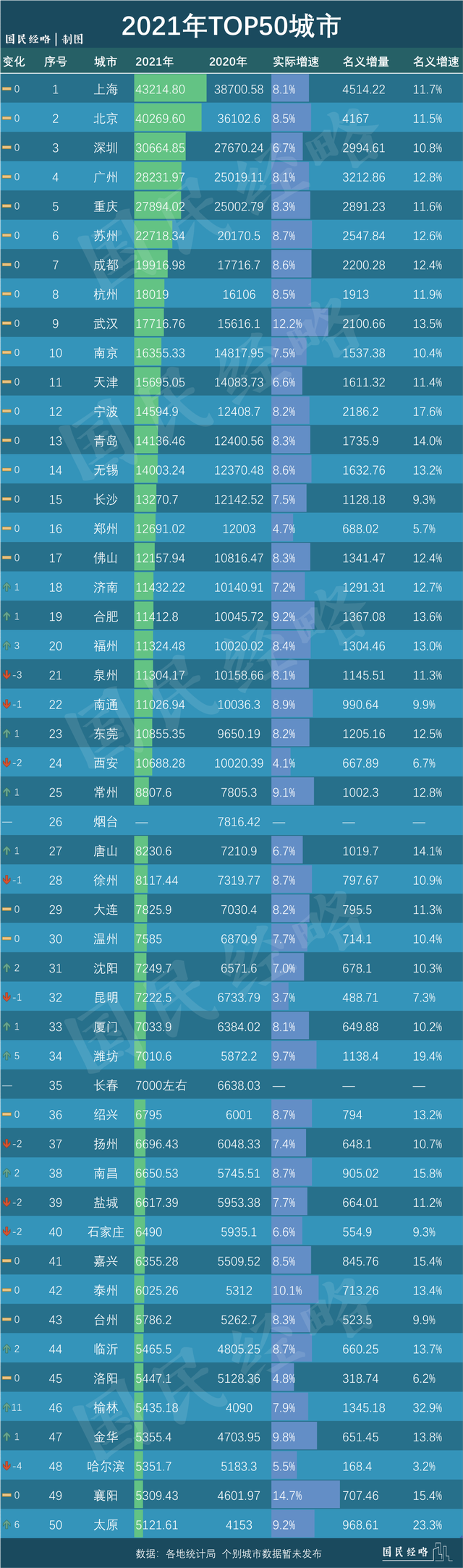 這是2021年內(nèi)地GDP50強城市排行榜: