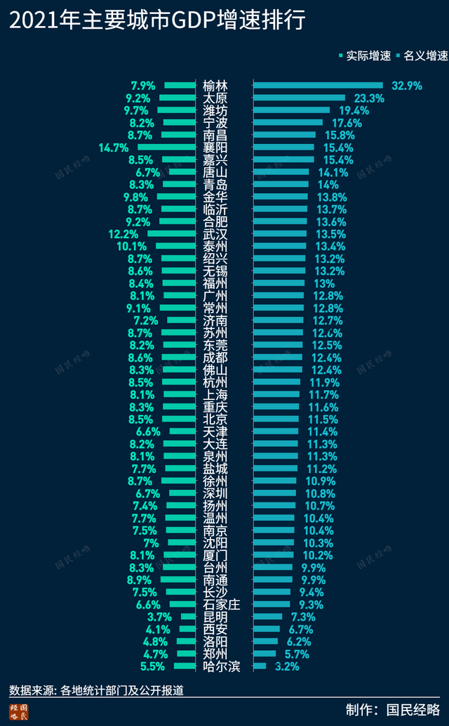 2021年,榆林、太原GDP名義增速分別高達32.9%、23.3%,城市排名分別躍升11位、6位,兩城更是得以晉級50強之列。