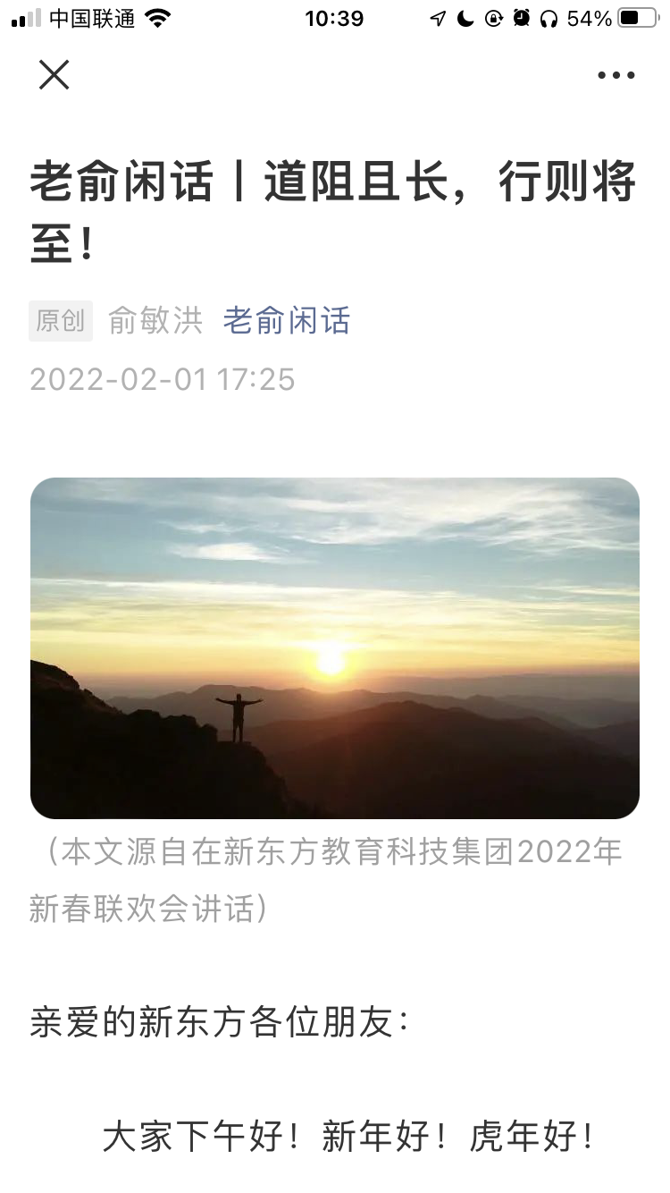 2022-02-02 14:31:09閱讀()互聯(lián)網(wǎng)昨天下午,俞敏洪在其個(gè)人公眾號(hào)上分享了其在新東方教育科技集團(tuán) 2022 年新春聯(lián)歡會(huì)講話。俞敏洪表示,2021 年的困難和曲折,對(duì)于新東方來說確實(shí)是一個(gè)重大的考驗(yàn)。