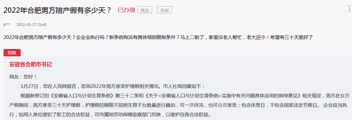 2022-02-15 11:53:08閱讀()合肥市人社局近日,有網(wǎng)友在人民網(wǎng)留言問,2022年合肥男方陪產(chǎn)假有多少天?企業(yè)會(huì)執(zhí)行嗎?