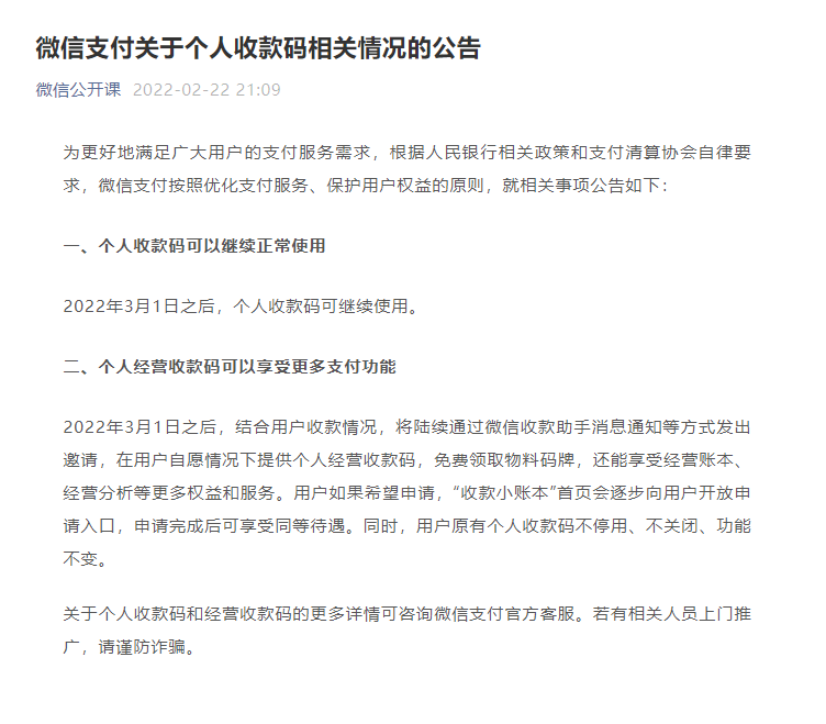 2022-02-23 15:40:46閱讀()互聯(lián)網(wǎng)2月22日消息,今天微信官方發(fā)布關(guān)于個人收款碼相關(guān)情況的公告,為更好地滿足廣大用戶的支付服務需求,根據(jù)人民銀行相關(guān)政策和支付清算協(xié)會自律要求,微信支付按照優(yōu)化支付服務、保護用戶權(quán)益的原則,就相關(guān)事項公告如下:
