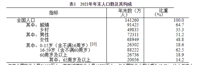 年末全國人口141260萬人,比上年末增加48萬人,其中城鎮(zhèn)常住人口91425萬人。全年出生人口1062萬人,出生率為7.52‰;死亡人口1014萬人,死亡率為7.18‰;自然增長率為0.34‰。全國人戶分離的人口5.04億人,其中流動人口3.85億人。