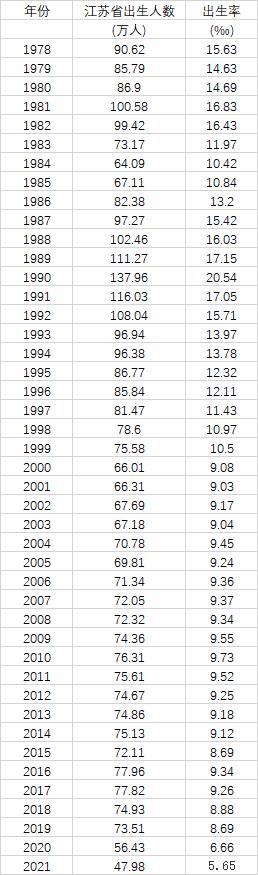 表:1978年以來(lái)江蘇歷年出生人口數(shù)據(jù)(數(shù)據(jù)來(lái)源:第一財(cái)經(jīng)記者根據(jù)《江蘇統(tǒng)計(jì)年鑒2021》、2021年江蘇省國(guó)民經(jīng)濟(jì)和社會(huì)發(fā)展統(tǒng)計(jì)公報(bào)整理)