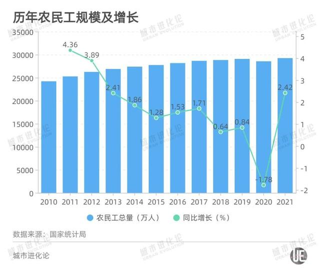 總體來(lái)看,我國(guó)農(nóng)民工總量從2010年的2.42億人,一路增至2019年的2.91億人,2020年疫情之下稍有回流,2021年離開(kāi)了農(nóng)村、離開(kāi)了田地的人又恢復(fù)到2.93億的水平。