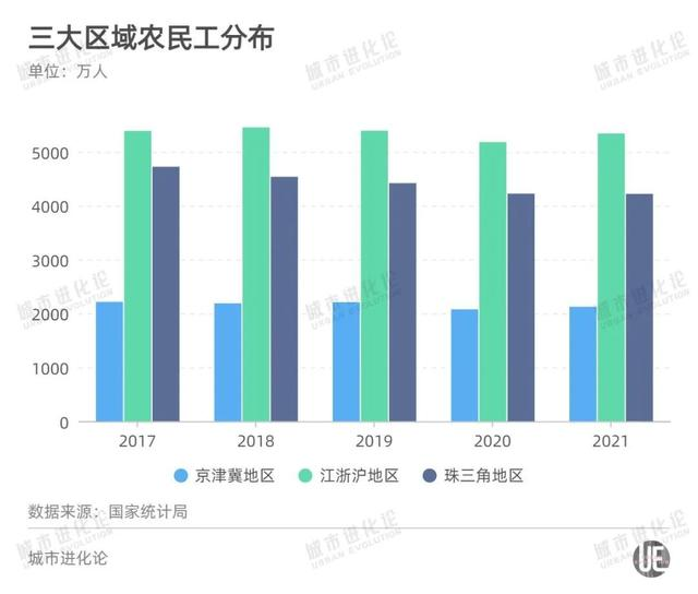珠三角地區(qū)尤其突出,2017年在珠三角地區(qū)的農(nóng)民工尚有4722萬(wàn)人,4年減少逾500萬(wàn),2021年為4219萬(wàn)人。