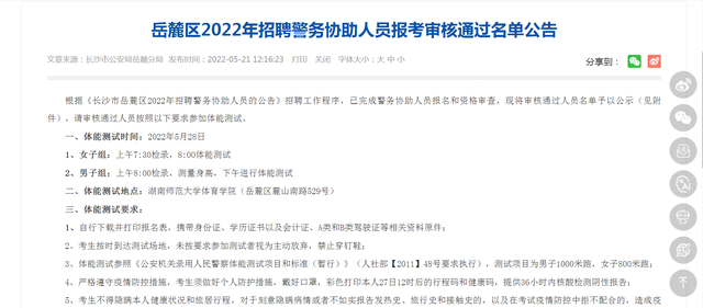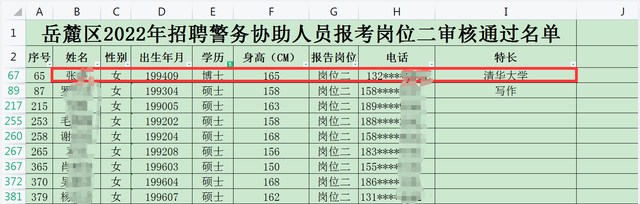 據(jù)長沙市岳麓區(qū)于5月21日中午12點(diǎn)公布的《岳麓區(qū)2022年招聘警務(wù)協(xié)助人員報(bào)考審核通過名單公告》顯示,在通過“警務(wù)協(xié)助人員崗位二”審核的人員表格中,出現(xiàn)了眾多本科碩士人員,其中最高學(xué)歷為一位1994年出生的張姓女博士(特長備注為“清華大學(xué)”),另有研究生10人,本科349人。公告顯示,名單中人員已完成警務(wù)協(xié)助人員報(bào)名和資格審查,將按照要求參加體能測試。不過,據(jù)@九派新聞報(bào)道,23日,岳麓區(qū)相關(guān)人員表示,該張姓博士系在校生,不符合招聘條件,因此遺憾未被錄取。