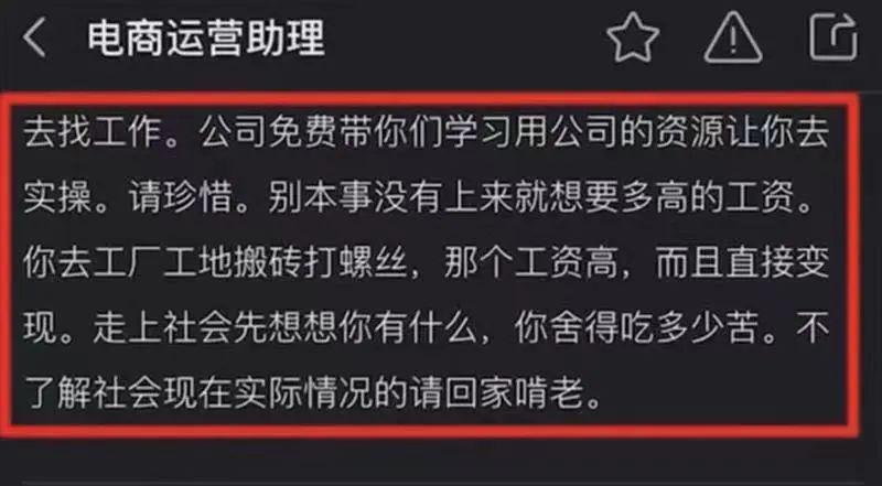 值得注意的是,該職位詳情一欄介紹:“想做運(yùn)營崗位又沒本事的朋友第一個(gè)月800元工資,不要覺得少,請(qǐng)放下姿態(tài),別本事沒有上來就想要多高的工資。”該招聘信息中還提到:“走上社會(huì)先想想你有什么,不了解社會(huì)現(xiàn)在實(shí)際情況的請(qǐng)回家啃老”。