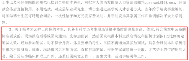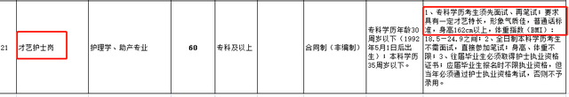 值得注意的是,該崗位在“其他條件”中要求:“??茖W(xué)歷考生須先面試、再筆試;要求具有一定才藝特長(zhǎng),形象氣質(zhì)佳,普通話標(biāo)準(zhǔn),身高162cm以上,體重指數(shù)(BMI):18.5—24.9之間”,但“全日制本科學(xué)歷考生不需面試,直接參加筆試;身高、體重不限”;往屆生須具有護(hù)士執(zhí)業(yè)資格證書(或成績(jī)合格證),應(yīng)屆生暫時(shí)不限執(zhí)業(yè)證書,但當(dāng)年必須參加護(hù)士執(zhí)業(yè)資格考試并成績(jī)合格,否則不予錄用。”
