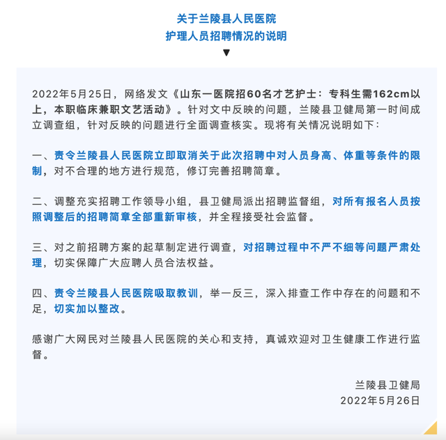 5月26日晚間,蘭陵縣衛(wèi)健局針對(duì)此事發(fā)布說(shuō)明稱,取消關(guān)于此次招聘中對(duì)人員身高、體重等條件的限制,對(duì)招聘過(guò)程中不嚴(yán)不細(xì)等問(wèn)題嚴(yán)肅處理。