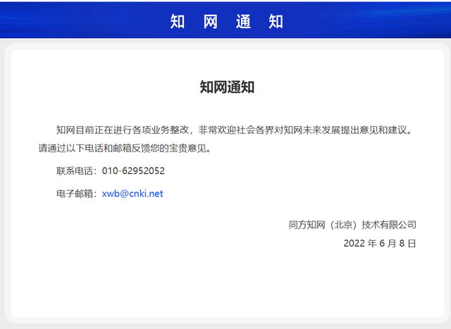 2022-06-10 10:20:28閱讀()知網(wǎng)6月8日,同方知網(wǎng)(北京)技術(shù)有限公司發(fā)布通知稱(chēng),知網(wǎng)目前正在進(jìn)行各項(xiàng)業(yè)務(wù)整改,非常歡迎社會(huì)各界對(duì)知網(wǎng)未來(lái)發(fā)展提出意見(jiàn)和建議。請(qǐng)通過(guò)以下電話(huà)和郵箱反饋您的寶貴意見(jiàn)。聯(lián)系電話(huà):010-62952052;電子郵箱:xwb@cnki.net