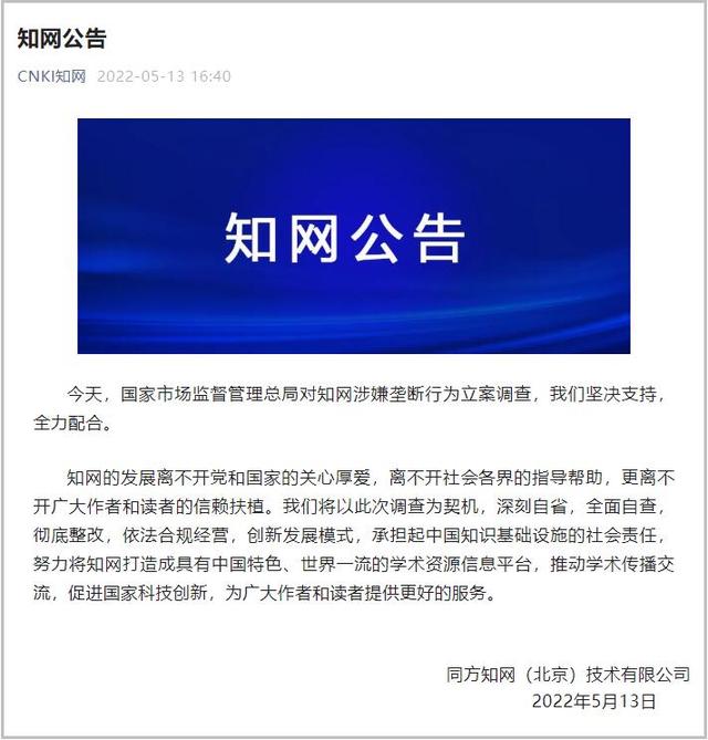 5月13日時(shí),同方知網(wǎng)(北京)技術(shù)有限公司曾發(fā)布公告稱(chēng),堅(jiān)決支持,全力配合國(guó)家市場(chǎng)監(jiān)督管理總局對(duì)知網(wǎng)涉嫌壟斷行為立案調(diào)查。