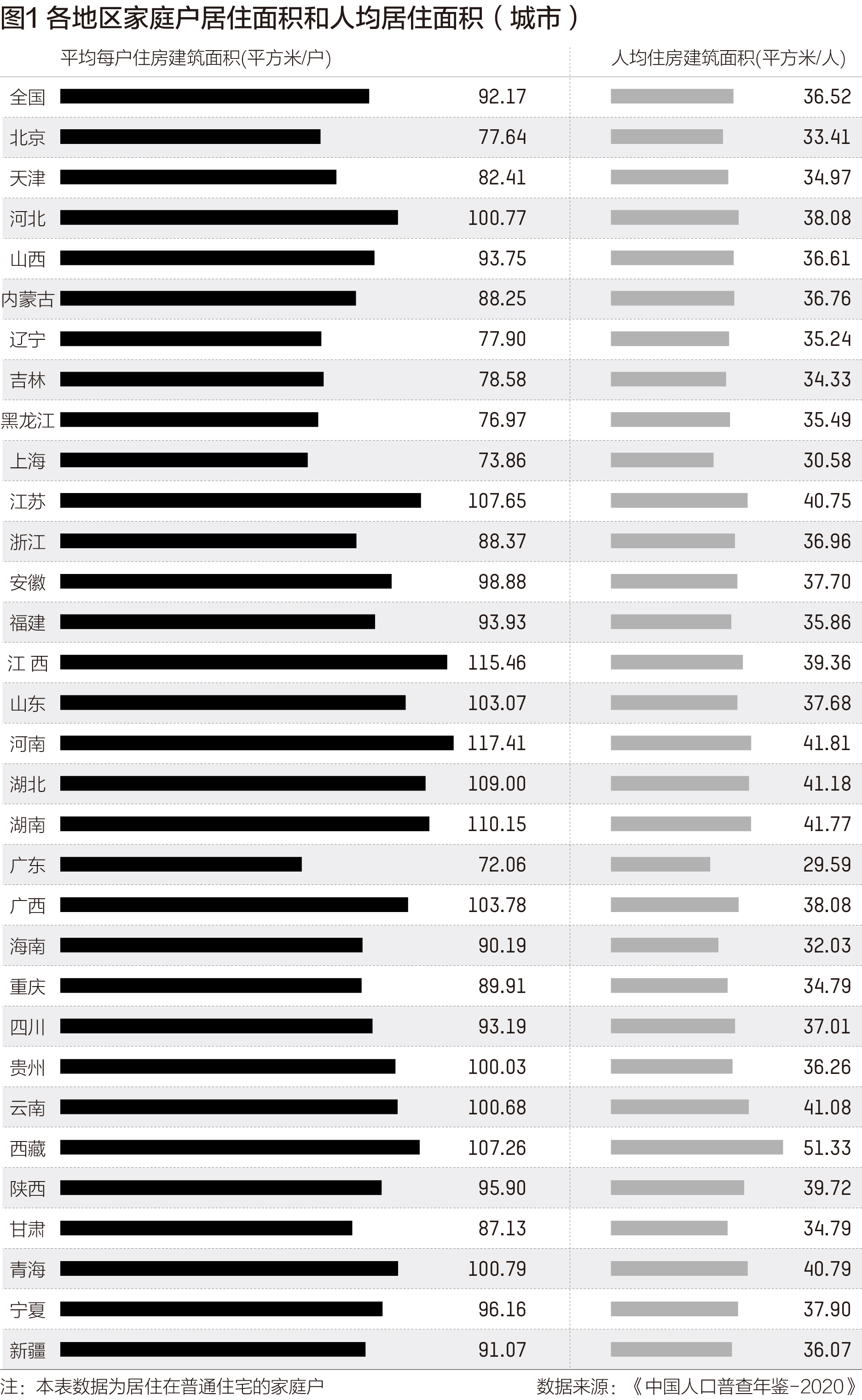 由于各個(gè)地區(qū)家庭結(jié)構(gòu)的差異,戶均人數(shù)也存在較大差異。因此,各地的城市人均居住面積數(shù)據(jù)更能直接反映各地居民的居住情況。數(shù)據(jù)顯示,2020年我國(guó)城市人均住房建筑面積為36.52平方米。