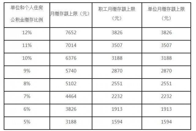 北京各住房公積金繳存比例對應的月繳存額上限。
