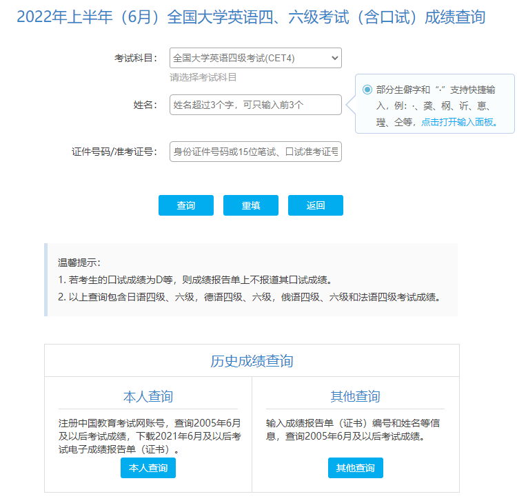 2022年上半年全國大學(xué)英語四、六級考試成績查詢