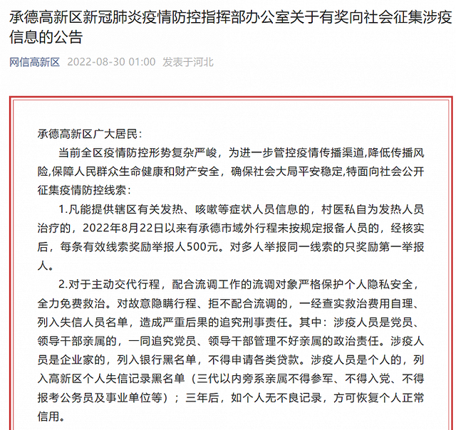 同日早前,“網(wǎng)信高新區(qū)”微信公眾號(hào)消息,承德高新區(qū)新冠肺炎疫情防控指揮部辦公室通告,當(dāng)前全區(qū)疫情防控形勢(shì)復(fù)雜嚴(yán)峻,為進(jìn)一步管控疫情傳播渠道,降低傳播風(fēng)險(xiǎn),保障人民群眾生命健康和財(cái)產(chǎn)安全,確保社會(huì)大局平安穩(wěn)定,特面向社會(huì)公開(kāi)征集疫情防控線索:
