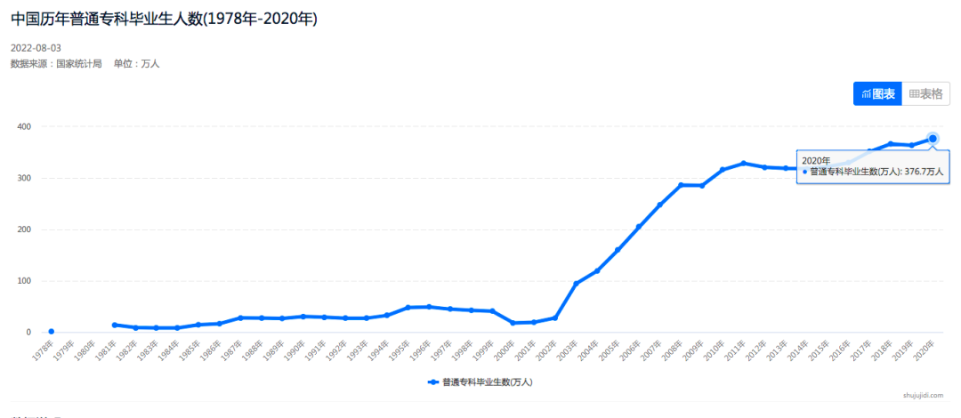(中國(guó)歷年普通??飘厴I(yè)生人數(shù),截圖自數(shù)據(jù)基地)