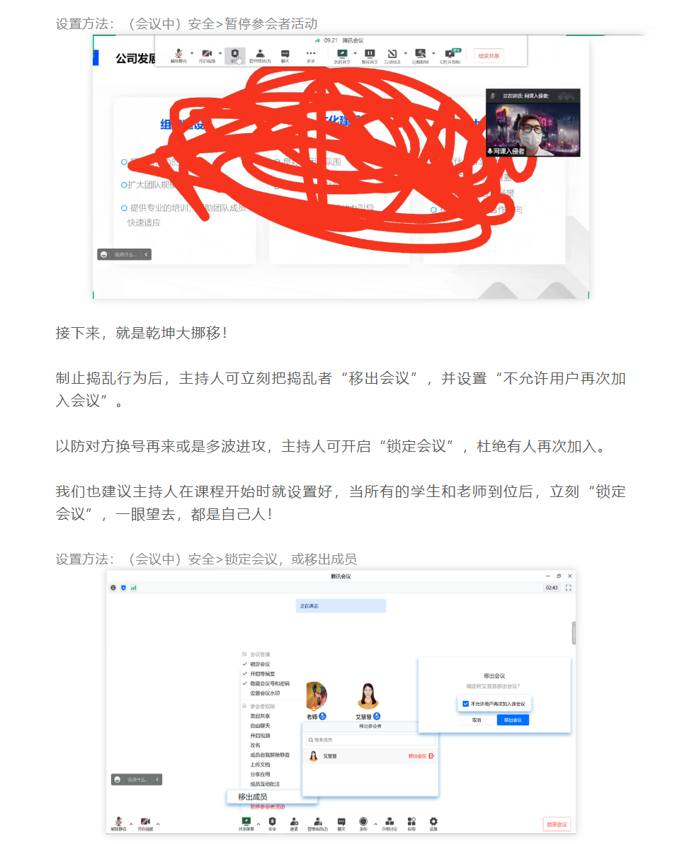 設(shè)置方法:(會(huì)議中)安全 > 暫停參會(huì)者活動(dòng)。制止搗亂行為后,主持人可立刻把搗亂者“移出會(huì)議”,并設(shè)置“不允許用戶再次加入會(huì)議”。建議主持人在課程開始時(shí)就設(shè)置好,當(dāng)所有的學(xué)生和老師到位后,立刻“鎖定會(huì)議”。