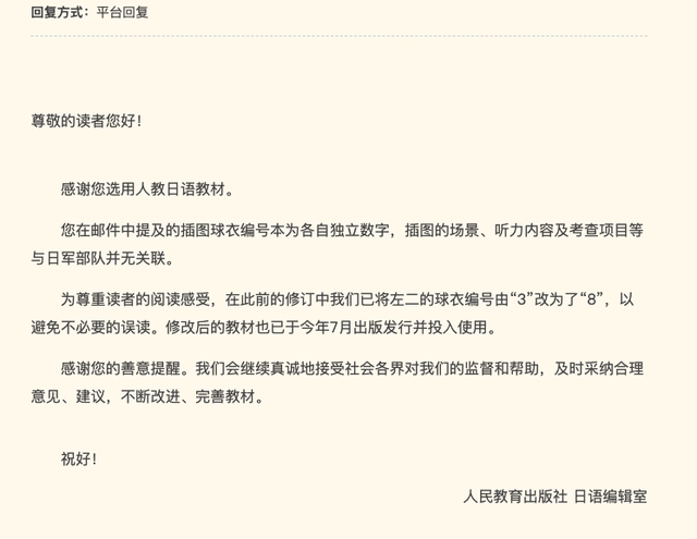 人教社日語編輯室對日語教材插圖問題的回復(fù)的截圖。人教社日語編輯室回復(fù)稱,上述日語教材插圖球衣編號本為各自獨立數(shù)字,插圖的場景、聽力內(nèi)容及考查項目等與日軍部隊并無關(guān)聯(lián)。“為尊重讀者的閱讀感受,在此前的修訂中我們已將左二的球衣編號由‘3’改為了‘8’,以避免不必要的誤讀。修改后的教材也已于今年7月出版發(fā)行并投入使用。”人教社日語編輯室還表示,“我們會繼續(xù)真誠地接受社會各界對我們的監(jiān)督和幫助,及時采納合理意見、建議,不斷改進、完善教材。”