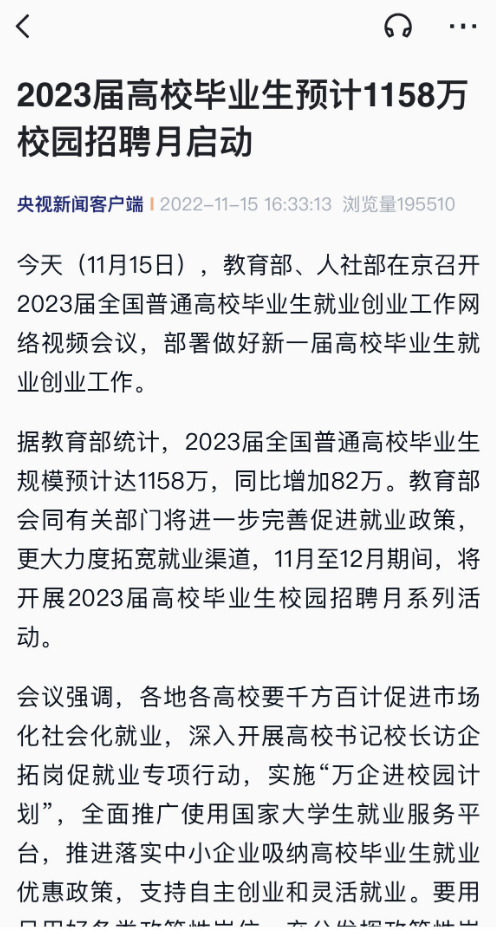 11月15日從教育部、人力資源社會保障部召開的2023屆全國普通高校畢業(yè)生就業(yè)創(chuàng)業(yè)工作網(wǎng)絡視頻會議上獲悉,2023屆全國普通高校畢業(yè)生規(guī)模預計達1158萬人,同比增加82萬人。教育部會同有關部門將進一步完善促進就業(yè)政策,更大力度拓寬就業(yè)渠道,實施就業(yè)創(chuàng)業(yè)促進行動,并將于11月至12月期間開展2023屆高校畢業(yè)生校園招聘月系列活動。