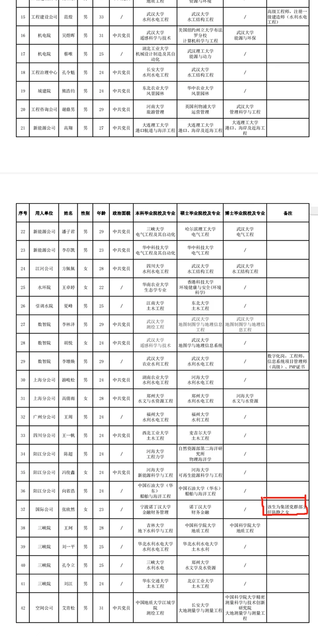 2023-02-08 14:29:07閱讀()大皖新聞2月7日,記者關(guān)注到,長江設(shè)計集團(tuán)有限公司于2023年2月2日發(fā)布了長江設(shè)計集團(tuán)2023年第三批擬聘人員信息公示,在公示表中記者看到該集團(tuán)國際公司招聘人員張欣然的公示信息中,專門備注“該生為集團(tuán)黨群部主任陳靜之女”。