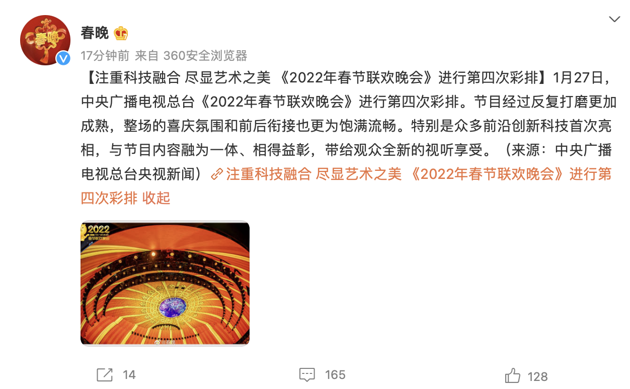 1月27日消息,據(jù)春晚官方微博消息,1月27日,中央廣播電視總臺《2022年春節(jié)聯(lián)歡晚會》進行第四次彩排,眾多前沿創(chuàng)新科技首次亮相,與節(jié)目內(nèi) ...